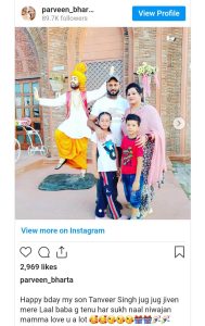 ਗਾਇਕਾ ਨੇ ਲਿਖਿਆ ਕਿ ‘ਹੈਪੀ ਬਰਥਡੇ ਮੇਰੇ ਪੁੱਤਰ ਤਨਵੀਰ ਸਿੰਘ, ਜੁੱਗ ਜੁੱਗ ਜੀਵੇ ਮੇਰੇ ਲਾਲ । ਬਾਬਾ ਜੀ ਤੈਨੂੰ ਹਰ ਸੁੱਖ ਨਾਲ ਨਿਵਾਜਣ, ਮੰਮਾ ਲਵ ਯੂ’।ਗਾਇਕਾ ਪਰਵੀਨ ਭਾਰਟਾ ਅਕਸਰ ਆਪਣੇ ਫੈਨਸ ਦੇ ਨਾਲ ਆਪਣੇ ਦਿਲ ਦੀਆਂ ਗੱਲਾਂ ਸਾਂਝੀਆਂ ਕਰਦੇ ਰਹਿੰਦੇ ਹਨ ਪਰਵੀਨ ਭਾਰਟਾ ਨੇ ਜਿਉਂ ਹੀ ਇਨ੍ਹਾਂ ਤਸਵੀਰਾਂ ਨੂੰ ਸਾਂਝਾ ਕੀਤਾ ਤਾਂ ਪ੍ਰਸ਼ੰਸਕਾਂ ਦੇ ਵੱਲੋਂ ਵੀ ਉਨ੍ਹਾਂ ਨੂੰ ਵਧਾਈਆਂ ਦੇਣ ਦਾ ਸਿਲਸਿਲਾ ਸ਼ੁਰੂ ਹੋ ਗਿਆ ।