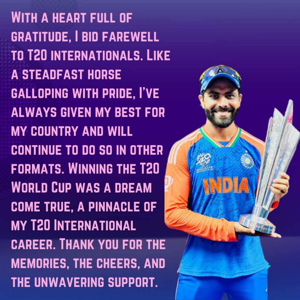 ਜਡੇਜਾ ਨੇ ਲਿਖਿਆ, “ਦਿਲ ਨਾਲ, ਮੈਂ ਟੀ-20 ਇੰਟਰਨੈਸ਼ਨਲ ਨੂੰ ਅਲਵਿਦਾ ਕਹਿੰਦਾ ਹਾਂ। ਮਾਣ ਨਾਲ ਦੌੜਦੇ ਹੋਏ ਅਡੋਲ ਘੋੜੇ ਦੀ ਤਰ੍ਹਾਂ, ਮੈਂ ਹਮੇਸ਼ਾ ਆਪਣੇ ਦੇਸ਼ ਲਈ ਆਪਣਾ ਸਰਵਸ੍ਰੇਸ਼ਠ ਦਿੱਤਾ ਹੈ ਅਤੇ ਹੋਰ ਫਾਰਮੈਟਾਂ ‘ਚ ਵੀ ਅਜਿਹਾ ਕਰਨਾ ਜਾਰੀ ਰੱਖਾਂਗਾ। ਟੀ-20 ਵਿਸ਼ਵ ਕੱਪ ਜਿੱਤਣਾ ਇਹ ਇਕ ਸੁਪਨਾ ਸੀ। ਮੇਰੇ ਟੀ-20 ਅੰਤਰਰਾਸ਼ਟਰੀ ਕਰੀਅਰ ਦਾ ਸਿਖਰ, ਯਾਦਾਂ, ਉਤਸ਼ਾਹ ਅਤੇ ਅਟੁੱਟ ਸਮਰਥਨ ਲਈ ਧੰਨਵਾਦ।’’
