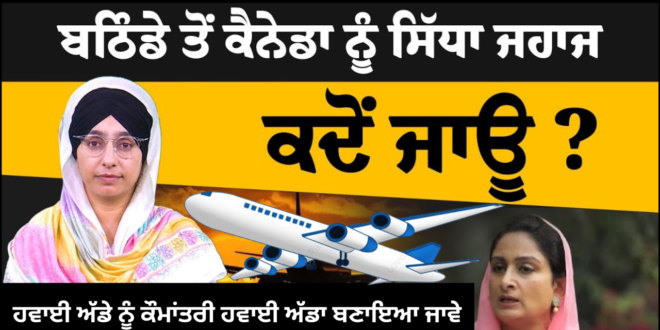 ਸ਼੍ਰੋਮਣੀ ਅਕਾਲੀ ਦਲ ਦੇ ਸੀਨੀਅਰ ਆਗੂ ਤੇ ਬਠਿੰਡਾ ਦੇ ਐਮਪੀ ਹਰਸਿਮਰਤ ਕੌਰ ਬਾਦਲ ਨੇ ਅੱਜ ਕੇਂਦਰੀ ਸ਼ਹਿਰੀ ਹਵਾਬਾਜ਼ੀ ਮੰਤਰੀ ਰਾਮਮੋਹਨ ਨਾਇਡੂ ਨੂੰ ਅਪੀਲ ਕੀਤੀ ਕਿ ਬਠਿੰਡਾ ਹਵਾਈ ਅੱਡੇ ਨੂੰ ਕੌਮਾਂਤਰੀ ਹਵਾਈ ਅੱਡੇ ਵਿਚ ਬਦਲਿਆ ਜਾਵੇ ਅਤੇ ਬਠਿੰਡਾ ਤੋਂ ਕੈਨੇਡਾ ਲਈ ਕੌਮਾਂਤਰੀ ਫਲਾਈਟਾਂ ਸ਼ੁਰੂ ਕੀਤੀਆਂ ਜਾਣ ਤਾਂ ਜੋ ਇਥੋਂ ਜਾਣ ਵਾਲੇ ਕੌਮਾਂਤਰੀ ਵਿਦਿਆਰਥੀ ਅਤੇ ਦੋਵਾਂ ਥਾਵਾਂ ਵਿਚਾਲੇ ਸਫਰ ਕਰਨ ਵਾਲੇ ਪਰਿਵਾਰਾਂ ਨੂੰ ਇਸਦਾ ਲਾਹਾ ਮਿਲ ਸਕੇ।