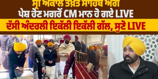 CM Mann Peshi at Akal Takht Sahib Live : ਮੁੱਖ ਮੰਤਰੀ ਭਗਵੰਤ ਮਾਨ ਨੇ ਪੇਸ਼ੀ ਤੋਂ ਬਾਅਦ ਪ੍ਰੈਸ ਕਾਨਫਰੰਸ ਕਰਕੇ ਜਾਣਕਾਰੀ ਦਿੱਤੀ ਤੇ ਕਿਹਾ ਕਿ ਸ੍ਰੀ ਅਕਾਲ ਤਖਤ ਸਾਹਿਬ ਸਿੱਖਾਂ ਦੀ ਸਰਬਉਚ ਅਦਾਲਤ ਹੈ ਤੇ ਮੈਂ ਨਿਮਾਨੇ ਸਿੱਖ ਵੱਜੋਂ ਪੇਸ਼ ਹੋਣ ਦੀ ਕੋਸ਼ਿਸ਼ ਕੀਤੀ।ਮੈਂ ਕੋਈ ਵੀ ਚੈਲੇਂਜ ਨਹੀਂ ਕੀਤਾ, ਮੈਂ ਕਦੇ ਵੀ ਅਜਿਹਾ ਸੋਚ ਨਹੀਂ ਸਕਦਾ ਕਿ ਸ੍ਰੀ ਆਕਾਲ ਤਖਤ ਸਾਹਿਬ ਨੂੰ ਚੈਲੇਂਜ ਕੀਤਾ ਜਾਵੇ। ਅਸੀਂ ਤਾਂ ਸੜਕ ‘ਤੇ ਜਾਂਦੇ ਹੋਏ, ਕਦੇ ਗੁਰੂ ਸਾਹਿਬ ਦੇਖ ਲਈਏ, ਤਾਂ ਨਤਮਸਤਕ ਹੋਈਦਾ।ਮੁੱਖ ਮੰਤਰੀ ਨੇ ਕਿਹਾ ਕਿ, ਸਿੰਘ ਸਾਹਿਬ ਨੇ ਕਿਹਾ, ਸਾਡੇ ਕੋਲ ਤੁਹਾਡਾ ਪੱਖ ਪਹੁੰਚ ਗਿਆ, ਇਸ ‘ਚ ਮੈਨੂੰ ਸੰਤੁਸ਼ਟੀ ਹੋਈ।